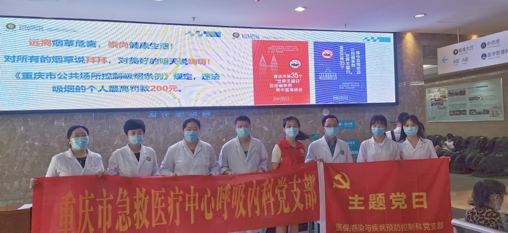 为广泛宣传控烟法规和烟草危害,努力营造公共场所控制吸烟良好氛围,大力倡导文明健康绿色环保生活方式,5月31日,重庆市急救医疗中心(重庆大学附属中心医院)开展了第35个世界无烟日主题党团日活动。