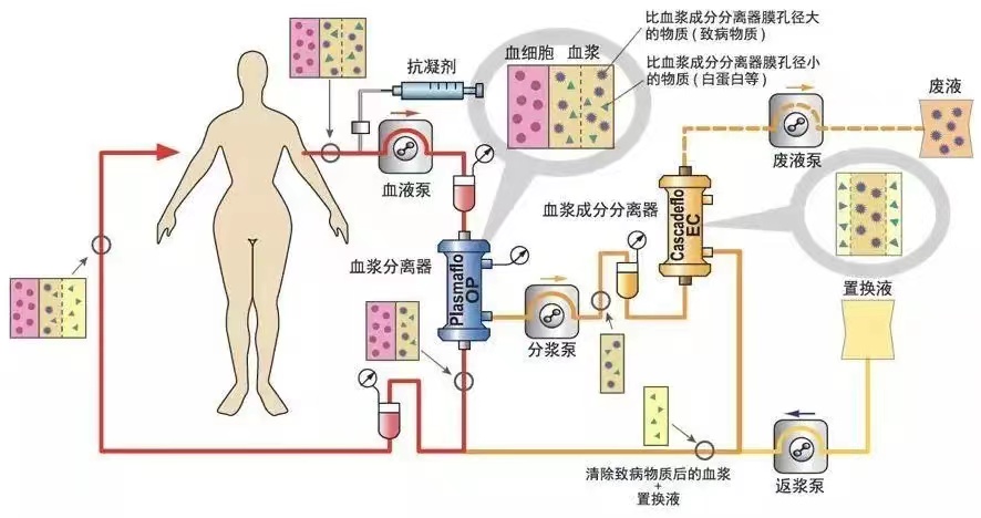 双重滤过血浆置换(DFPP)利用对流基本原理,第一级血浆分离器孔径约为0.2μm,从全血中分离出血浆成分物质,第二级血浆成分分离器中空纤维柱孔径约为0.03μm,用于分离血浆中的相对分子质量远远大于白蛋白的致病因子,如免疫球蛋白、免疫复合物、脂蛋白等丢弃,然后将含有大量白蛋白的血浆成分回输至体内,并且还可以根据第二级滤器不同孔径控制血浆蛋白的除去范围。 DFPP能迅速清除患者血浆中的脂蛋白、免疫复合物、抗体、 抗原等致病因子,调节免疫系统,清除封闭性抗体,恢复细胞免疫功能及网状内皮细胞吞噬功能,使病情得到缓解。