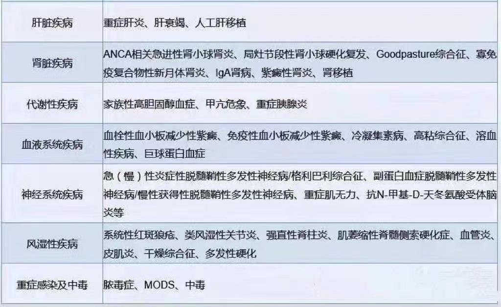 1.降低高血脂、高胆固醇预防高血压。2.清除慢性炎症因子,控制慢性疾病急性发作的风险。3.清除体内环境毒素和重金属,预防癌症发生。4.清除血液中的过敏源,预防过敏发生。5.清除肝脏内毒素,提升肝脏的解毒功能。6.修复受损的心肌和血管壁,预防心脑血管疾病。7.提高肠道代谢功能,改善便秘。8.提高人体免疫力,降低感染疾病的几率。9.改善皮肤暗黄、毛孔粗大及色斑,消除过敏皮肤症状,恢复皮肤的弹性和光泽,抵抗衰老。10.定期进行血液净化,能使身体器官机能提升 ,激活细胞,改善内分泌环境。 目前临床上,由于血浆的短缺及患者的病情需要,进行双重血浆置换(DFPP)治疗的需求日益增多,DFPP模式的优势在于能够选择性清除血液中致病的大分子物质,如:免疫球蛋白、免疫复合物、抗体、类风湿因子、内毒素及炎性介质、胆红素、LDL、病毒等,同时提高病原物质清除率,减少血浆使用量、降低血浆过敏反应几率,为原发病的治疗创造了有力条件,适用于肾脏疾病、代谢性疾病、血液系统疾病、神经系统疾病、风湿性疾病等,是非常高效的体外血液净化技术。