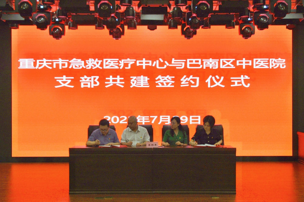 在巴南区中医院会议大厅,重庆市急救医疗中心党委委员、副院长周月琴和巴南区中医院党委专职副书记陈兴碧分别致辞,并宣布了签约仪式的开始,参与结对共建的党支部书记在结对共建协议书上签字,标志着为期两年的结对共建拉开帷幕。重庆市急救医疗中心外联顾问官晓鸣,巴南区中医院副院长杨永红出席活动。