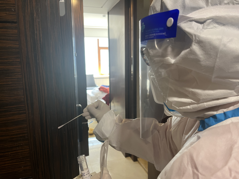 防护服、N95口罩、面屏、靴套,他们每天穿戴整齐,从早上开始,对整个驻地宾馆的物表进行采样检测,采集样本完成后就要对环境进行消杀工作。消杀组组员张万怡说:“虽然只是在驻地进行工作,但我觉得每一个任务都非常重要,同志们在前线辛苦工作,我们一定要让他们有一个绝对安全的休息空间,能为大家做一点后勤保障的事情,我也是很自豪的!”