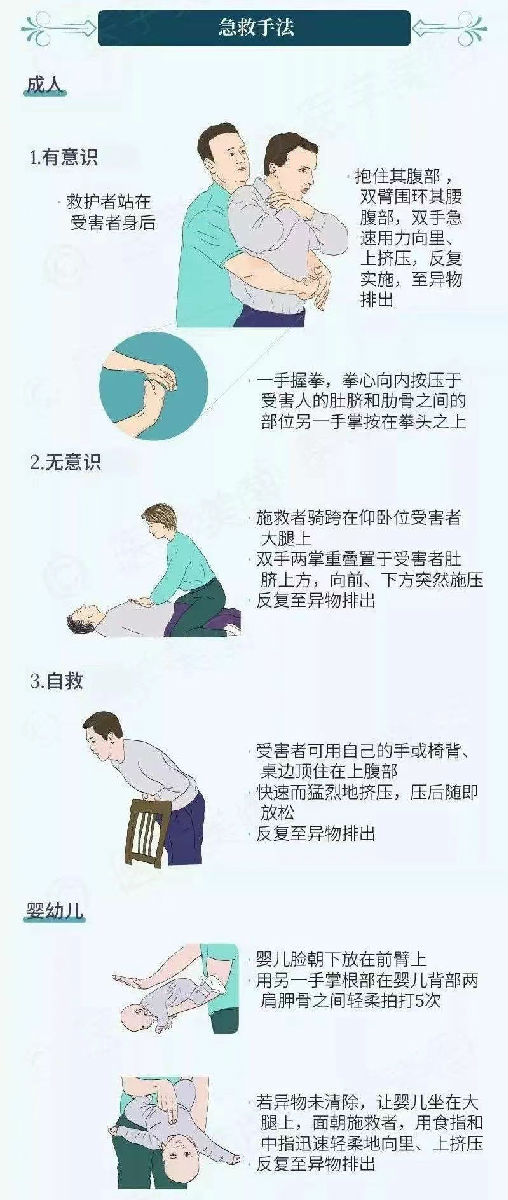 自救互救:镇静制动,舒适位休息,有条件时吸氧。哮喘患者可以吸入备药。对于异物吸入窒息者,立即采用海姆立克急救法。