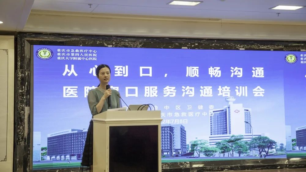 为构建和谐医患关系,促进医疗服务水平提升,提高沟通成效,由渝中区卫生健康委主办、重庆市急救医疗中心/重庆大学附属中心医院承办的“从心到口,顺畅沟通”医院窗口服务沟通培训会于2022年7月8日下午在市急救医疗中心学术厅召开。本次培训得到渝中区内30家医疗机构、区外51家医联体单位积极响应,我院院领导及医务人员共200余人参加了此次培训会,会议由重庆市急救医疗中心药剂科主任郑晓媛主持。