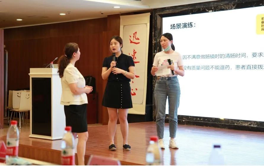 随后,培训进入互动环节。我院窗口服务人员结合窗口服务沟通工作中遇到的实际问题,对患者就诊过程中,如门诊药房、门诊部(导医台,分诊台)、收费处、医保科的经典案例进行情景模拟,唐老师现场指导大家如何在礼貌婉拒不合理要求的同时,让患者感受到来自医务人员的尊重与关怀,帮助大家提高服务的沟通技巧。