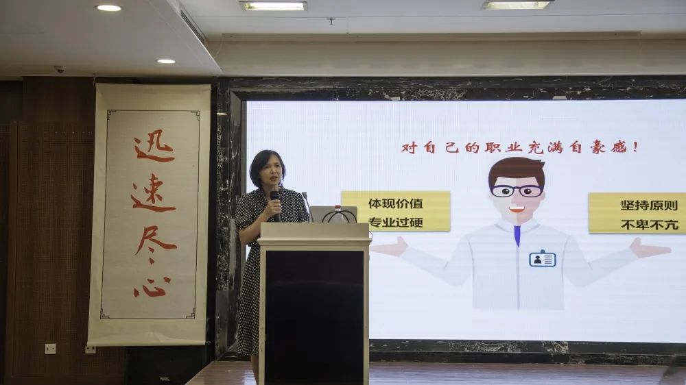 会上,特邀讲师唐娜老师首先从医患沟通效果的内因、外因进行分析,然后从如何保持良好心态、做到五心服务入手,详细讲解了自身情绪调整控制的方法。随后,唐老师教大家如何用心尊重患者,从四个方面开展正面沟通:一是要保持良好的礼仪形象和肢体语言;二是要善于聆听问题、理解需求;三是要表达清晰、语言通俗易懂;四是妥善回应质疑、体现专业素养。最后,她还讲解了四种不同的沟通风格,以及如何通过识别沟通风格、调整沟通方式,灵活地与不同风格的人进行沟通,营造良好的窗口就医氛围。