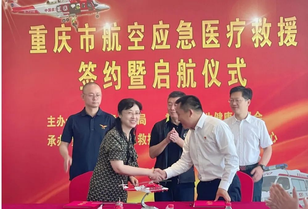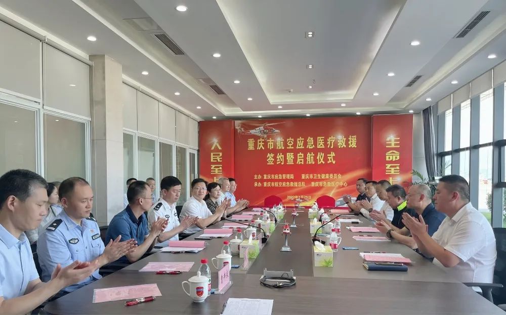 为深入践行“人民至上、生命至上”理念,按照《“健康中国2030”规划纲要》《“十四五”国家应急体系规划》文件精神,充分发挥航空应急救援安全高效的“应急”优势和医疗急救体系“救”的优势,建立市航空应急救援总队和市急救医疗中心高效联动机制,在突发事件或紧急情况处置中,开展航空应急医疗救援公益性服务,7月29日,市应急局与市卫生健康委在航空应急救援龙兴基地举行了航空应急医疗救援签约暨启航仪式。市应急局副局长汪绍敏、市卫生健康委副主任李畔,以及市公安局、市交通局、民航重庆监管局、民航重庆空管分局、两江航投集团、海直通航等有关部门和单位代表出席仪式。