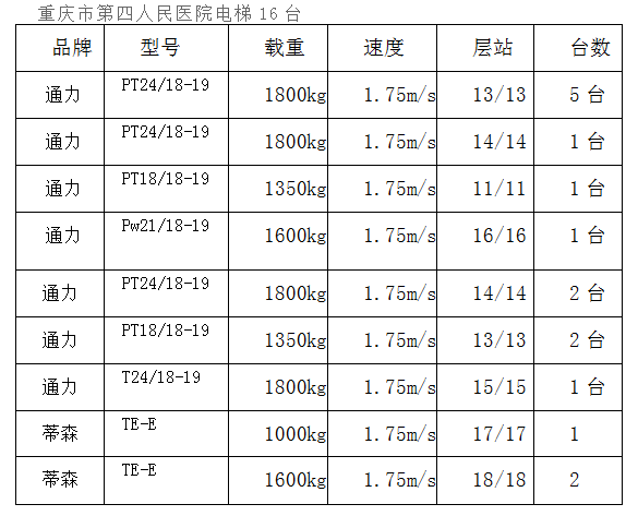 重庆市第四人民医院共有电梯16台,分别安装在健康路1号门诊住院综合大楼和培训大楼。这些电梯设备的日常维修保养服务的招标要求如下: