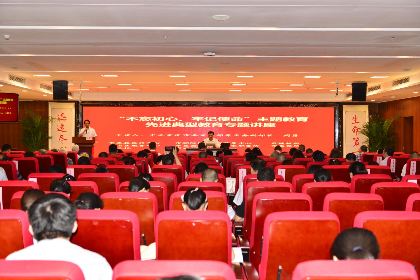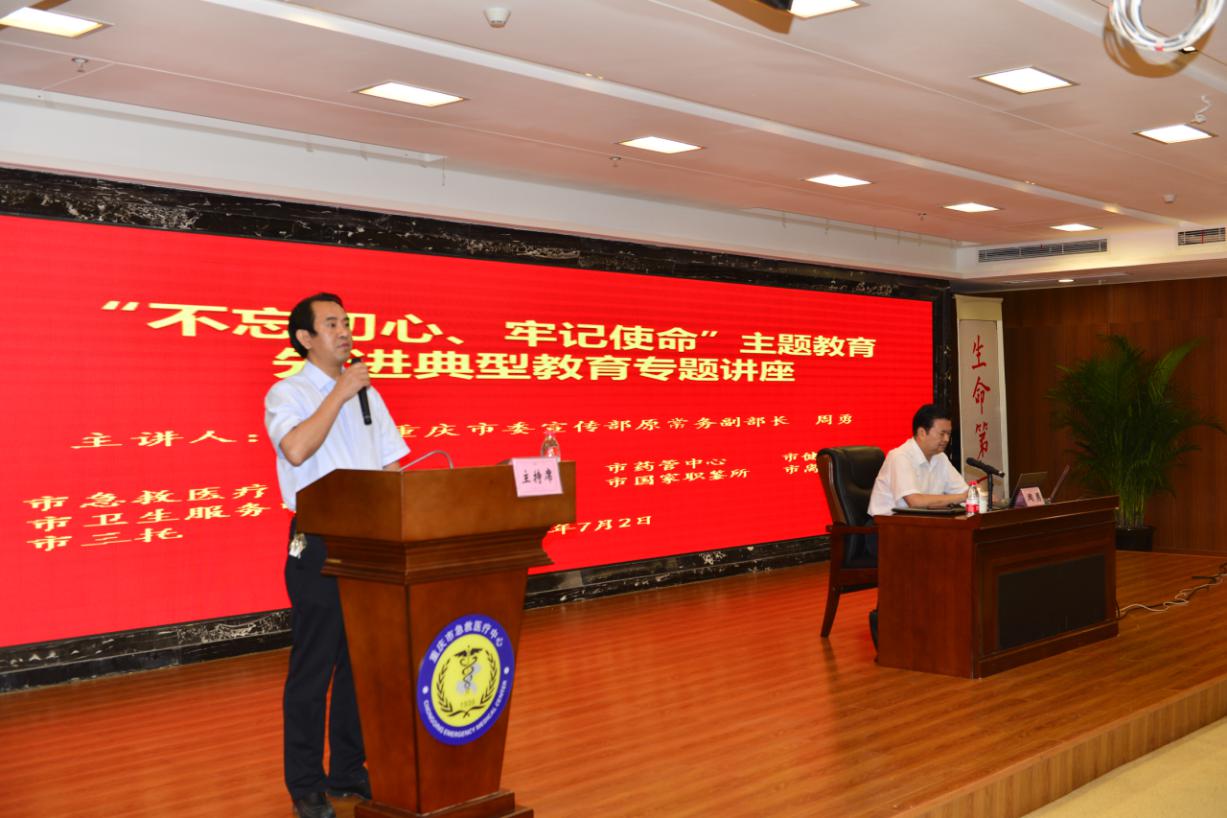 为深入开展“不忘初心、牢记使命”主题教育,大力宣传秉持理想信念、保持崇高境界、坚守初心使命、敢于担当作为的先进典型。2019年7月2日,市急救医疗中心会同市离保所、市职防院等部分委属单位举行了先进典型教育,邀请中共重庆市委宣传部原常务副部长周勇同志作了题为“重庆共产党人的初心和使命”的专题讲座。我院党员干部、离退休老干部代表和共同参加学习的部分委属单位党员干部共计200余人聆听了讲座。