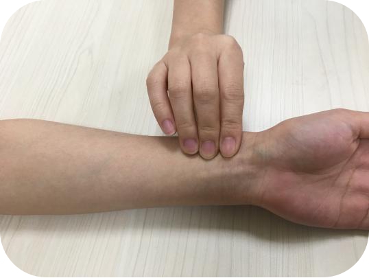 1.将食指、中指、无名指并拢,指腹平放于被测者手腕外侧桡动脉处,手指压力以清楚触到脉搏为宜。