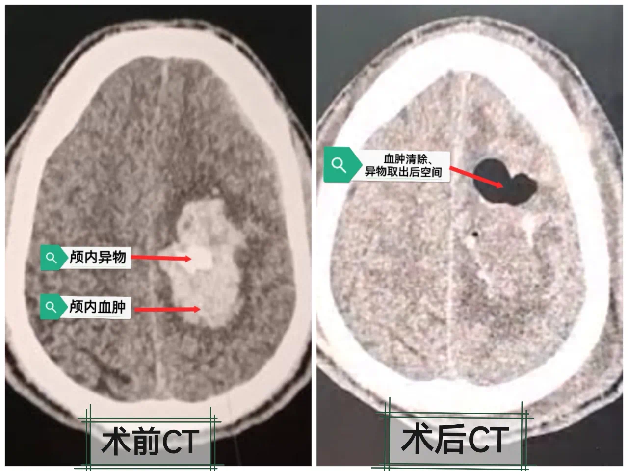 术后第一天患者复查CT显示颅内血肿及异物完全清除,患者意识恢复清醒,可以简单说话,并与医护人员简单交流。