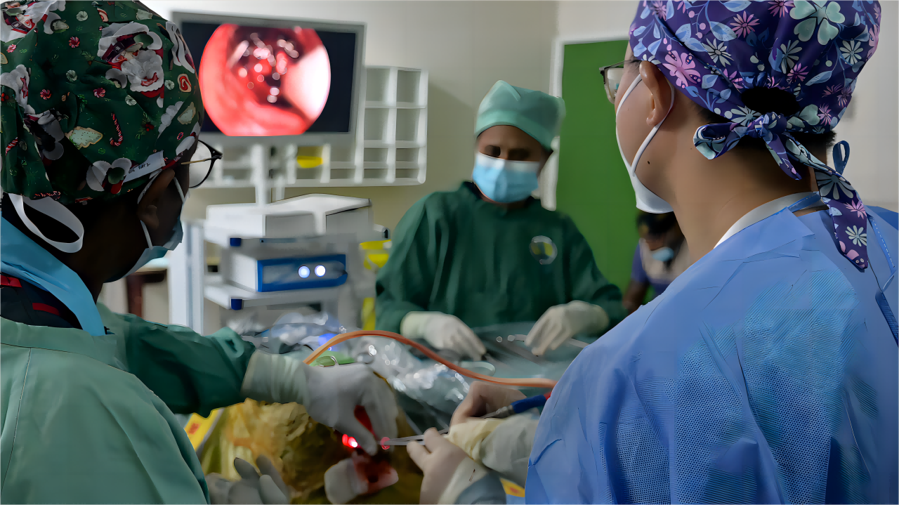 在经中国医疗队综合讨论病情后,余星医师指出患者确实需手术治疗,否则可能永久不能说话、右侧肢体不能活动,同时极大可能继发癫痫、脑脓肿甚至死亡。余星医师提出“利用神经内镜技术清除脑内血肿及取出异物”的治疗方案,这一方案与传统手术相比,术中创伤微乎其微,同时可使用医疗队从国内带来的神经内镜透明通道装置(该装置由重庆市急救医疗中心神经外科唐小勇、袁鹏医师自主设计研发)。