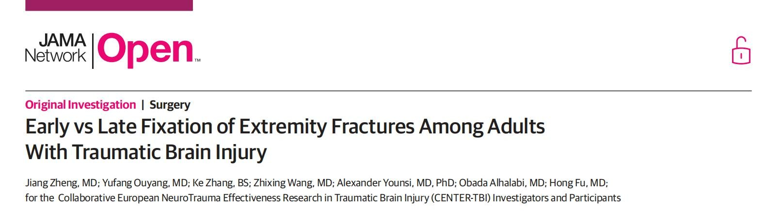 近日,重庆大学附属中心医院(重庆市急救医疗中心)麻醉科傅洪教授团队与欧洲创伤性脑损伤神经创伤有效性合作研究项目(CENTER-TBI)和德国海德堡大学神经外科Alexander Younsi教授团队关于创伤性脑损伤(Traumatic brain injury,TBI)后四肢骨折手术时机优化这一全球性疑难问题的联合研究成果Early vs Late Fixation of Extremity Fractures Among Adults With Traumatic Brain Injury,在由美国医学会American Medical Association出版发行的国际顶级SCI期刊JAMA Network Open在线发表。该刊是美国医学会会刊JAMA的子刊,是国际公开发行的同行评审开放获取综合性医学杂志,已发表了大量高质量临床医疗和全球卫生政策的研究。该刊为Top期刊,JCR和中科院分区均为1区,2022影响因子13.8。