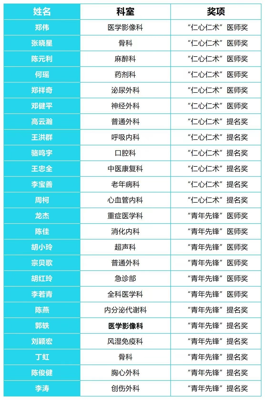 经过科室推荐、初审评选、网络投票,并经院长办公会讨论通过、党委会研究决定,最终评选出“仁心仁术医师”6名,“青年先锋医师”6名。